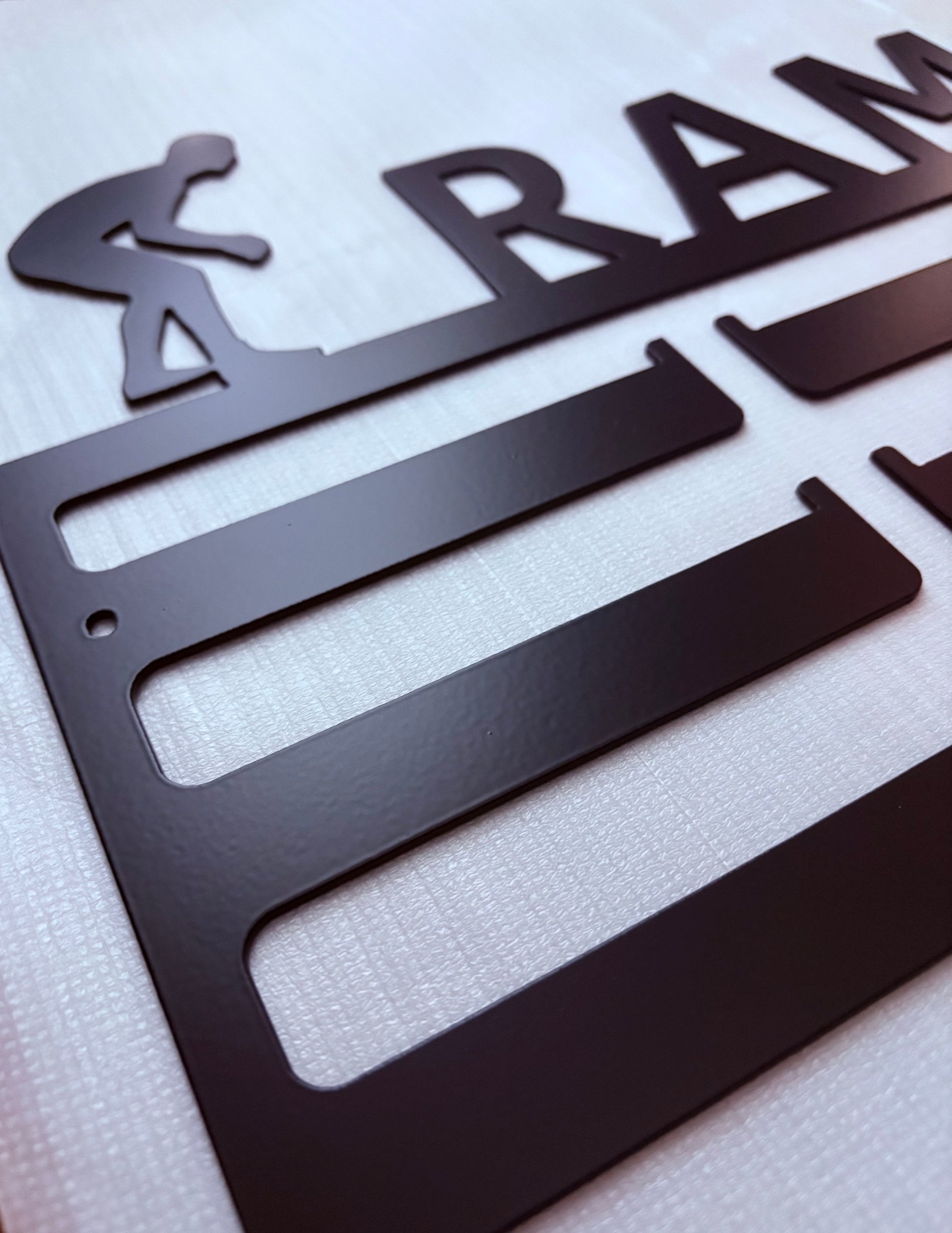 Our custom medal hangers are precision-cut from U.S. recycled carbon steel and finished in a sleek matte black powder coat for a clean, modern look that lasts. Each piece is personalized with your athlete’s name, and features two sport-specific silhouette designs—one on each side—for a bold, meaningful display.